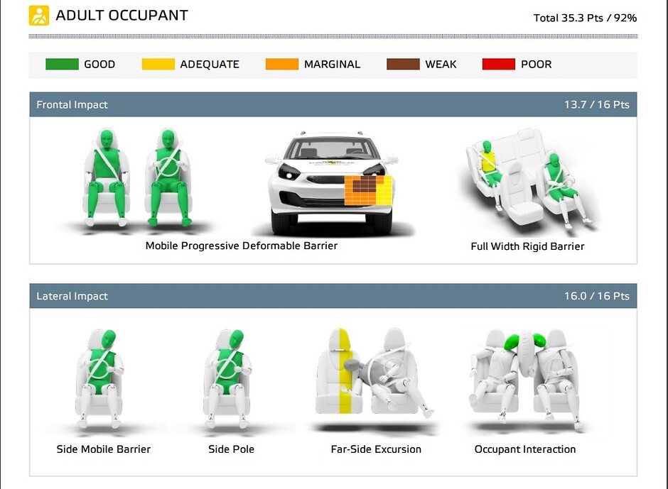 Найвищу оцінку новинка змогла заробити за підсумками випробування безпеки водія та дорослих пасажирів. У цій категорії автомобіль зміг заробити 92%. Майже в усіх тестуваннях рівень навантаження на манекени залишився в зеленій зоні. Єдине що потрапило у жовту зону, це торс заднього пасажира при фронтальному зіткненні з повним перекриттям і рівень навантаження при боковому ударі. Втім, в обох ситуаціях перевищення навантаження було визнане мінімальним.